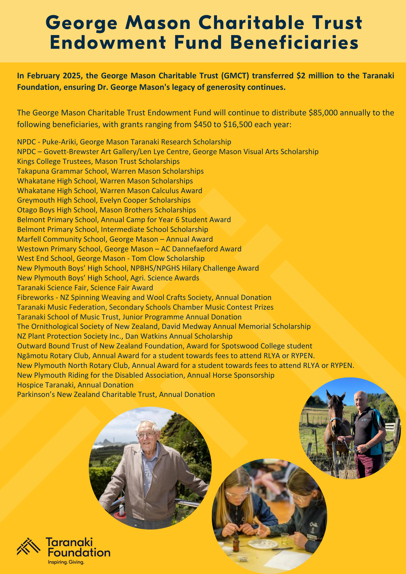 In February 2025, the George Mason Charitable Trust (GMCT) transferred $2 million to the Taranaki Foundation, establishing a named fund to perpetuate Dr. George Mason’s enduring legacy.  This ensures his philanthropic vision thrives for generations to come, with the Taranaki Foundation safeguarding and administering the funds according to the Trust’s original intentions.